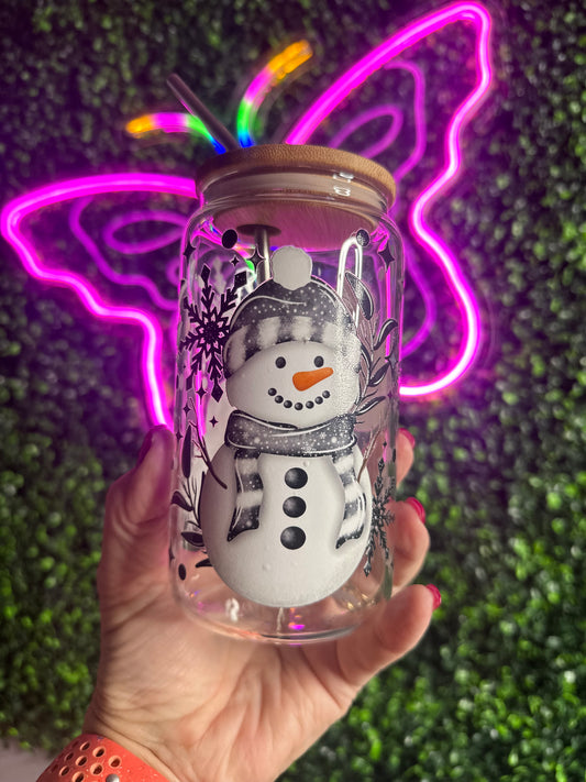 Christmas Winter Snowman 16 oz glass cup with lid & straw