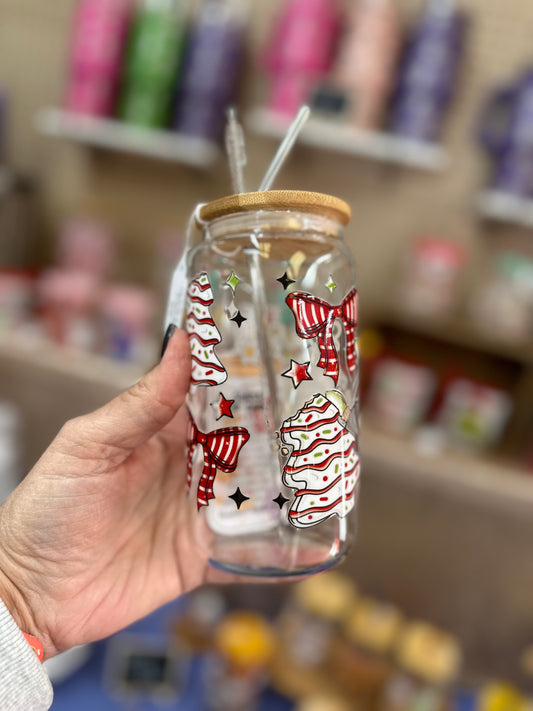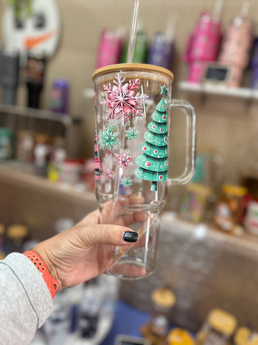 CHRISTMAS Tree 40oz glass cup with bamboo lid and plastic straw