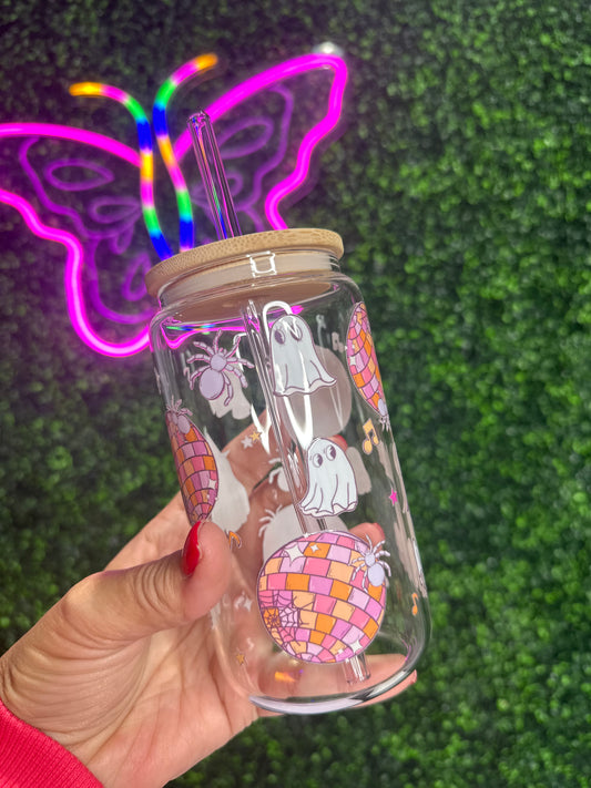 Disco Ghost 16oz glass Cup with lid & straw