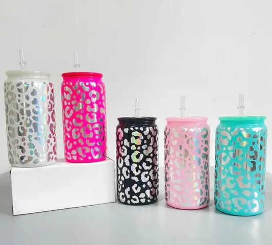 16oz glass engraved leopard print cup