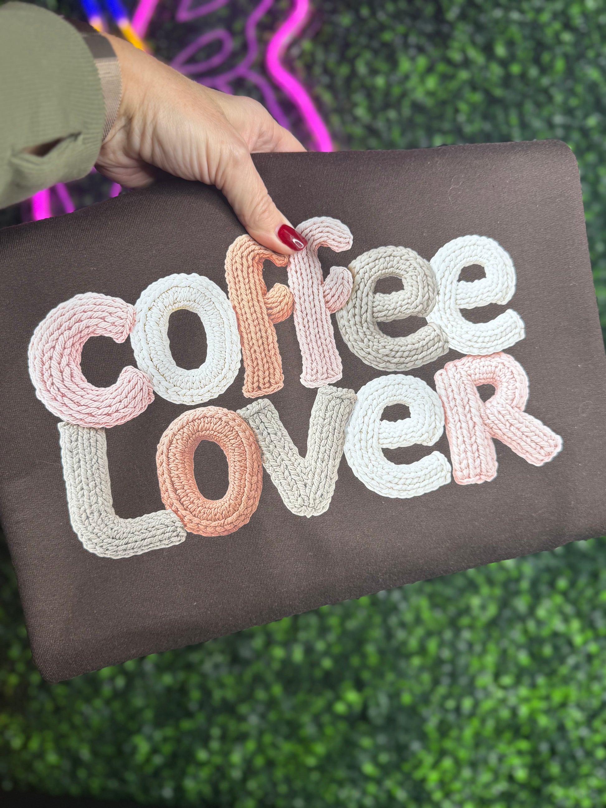 Coffee Lover faux Knitted Yarn sweatshirt. Features a cute colorful coffee lover design on the sweatshirt. It’s soft cute & full of fun. Soft fleece, relaxed fit, and perfect for everyday wear.