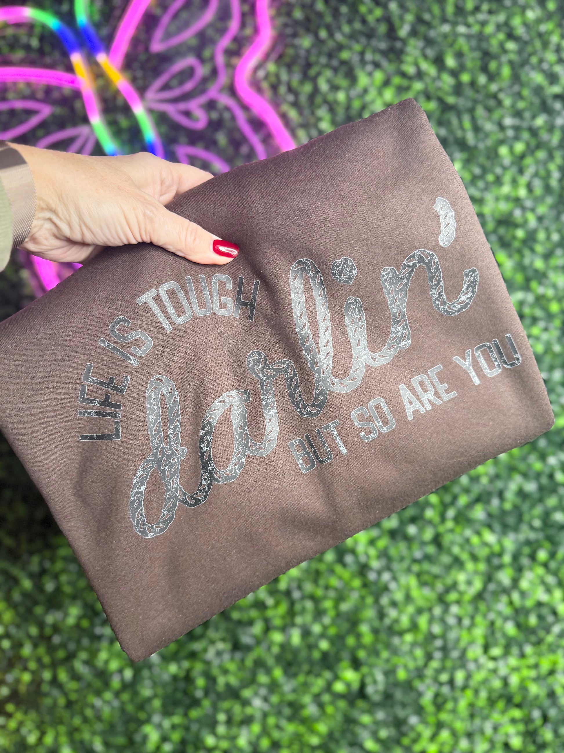 One of my favorites, Life Is Tough Darling But So Are You sweatshirs. This adorable meaningful sweatshirt is soft cute and full encouragement. It featuring a western look designs! Soft fleece, relaxed fit, and perfect for everyday wear.
