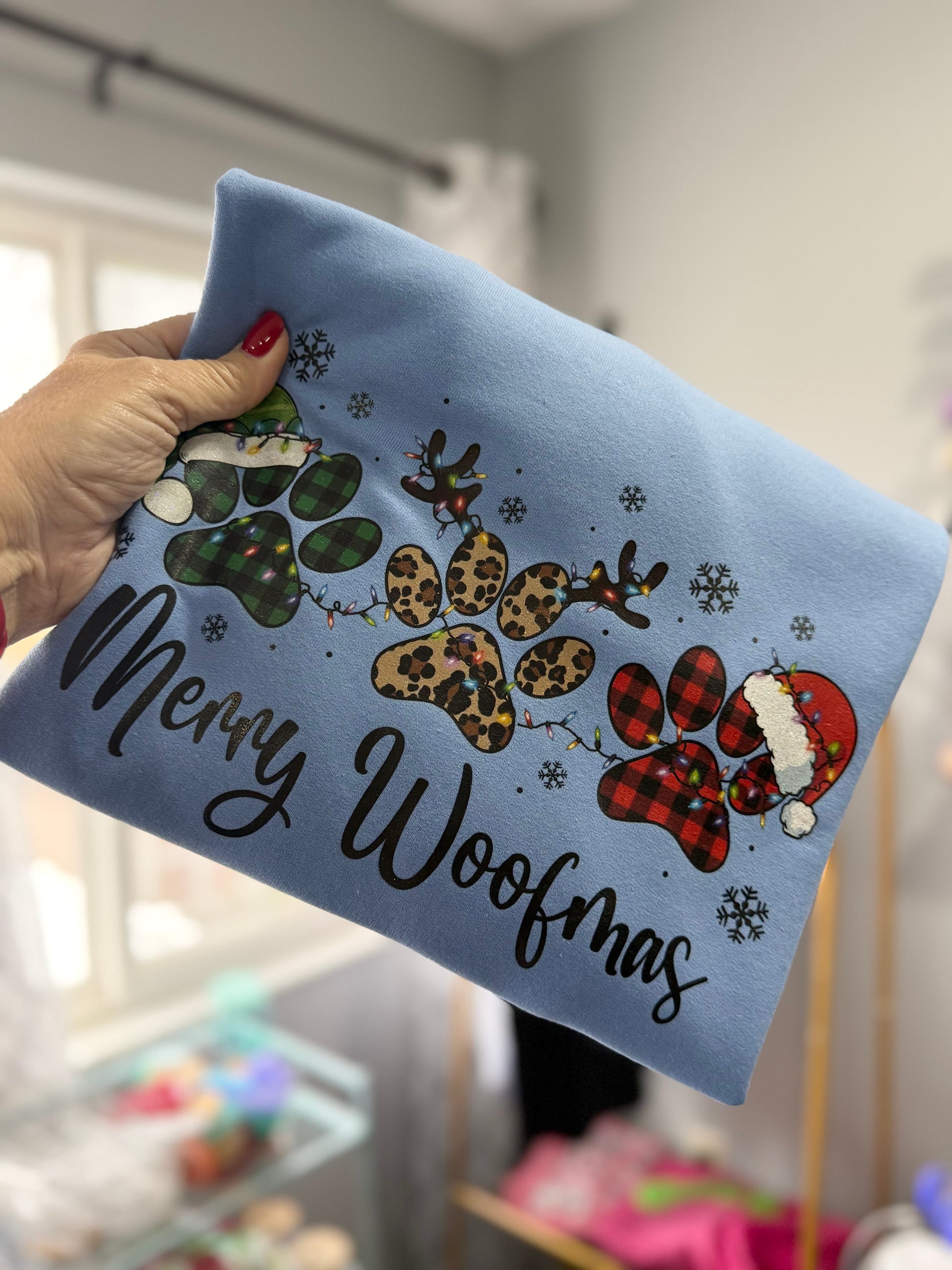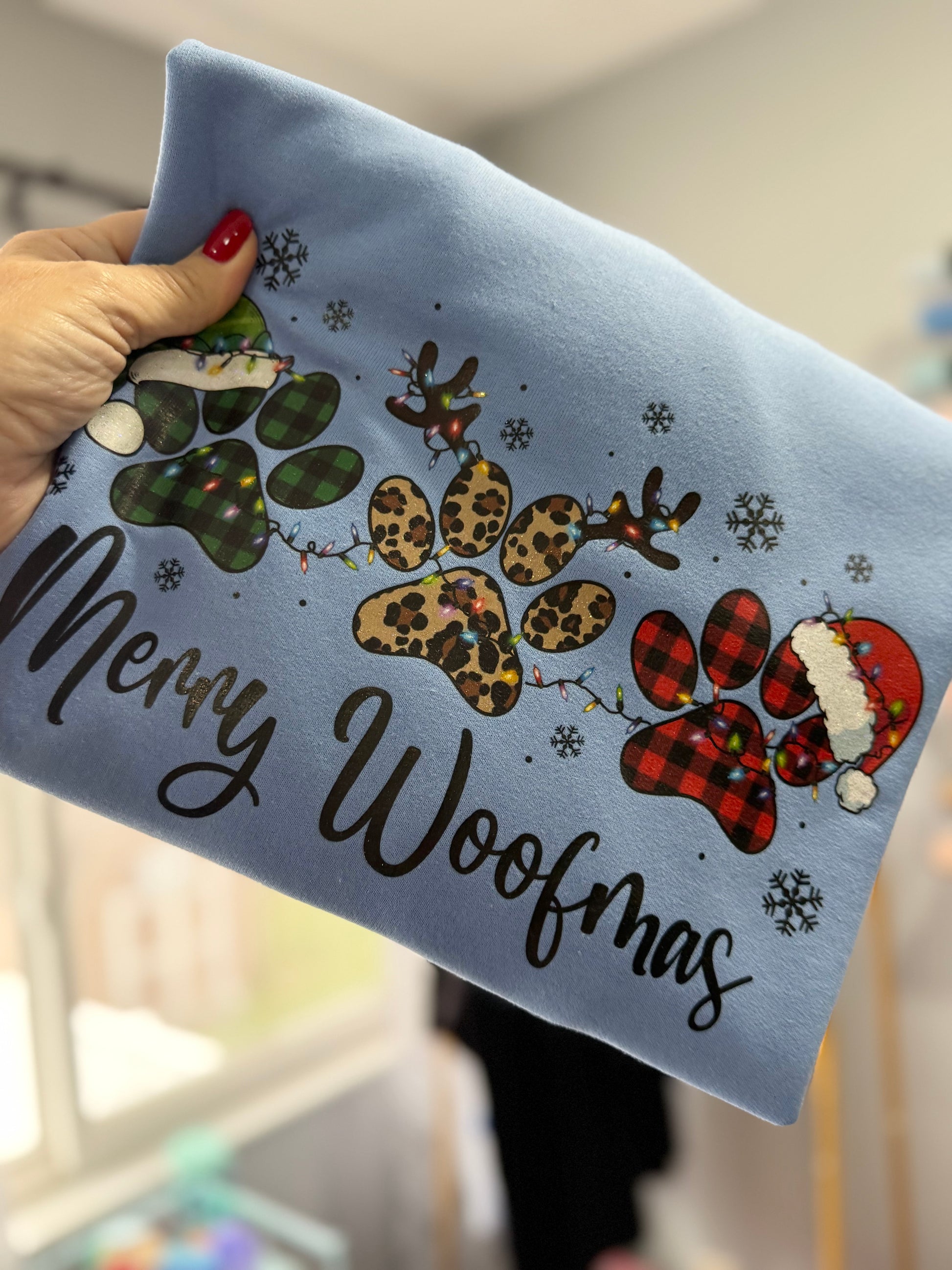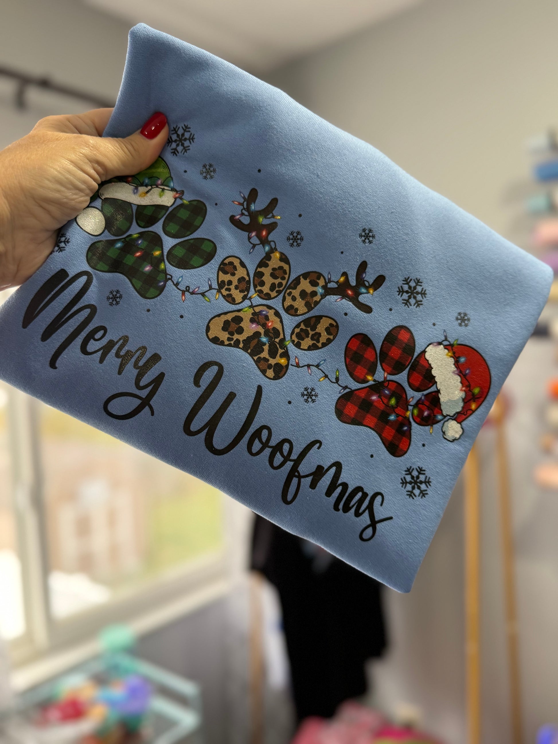 A fun yet festive Holiday crewneck sweatshirt featuring 3 cute pawprints with a Merry Woofmas design! Soft fleece, relaxed fit, and perfect for holiday photos or gifting.
