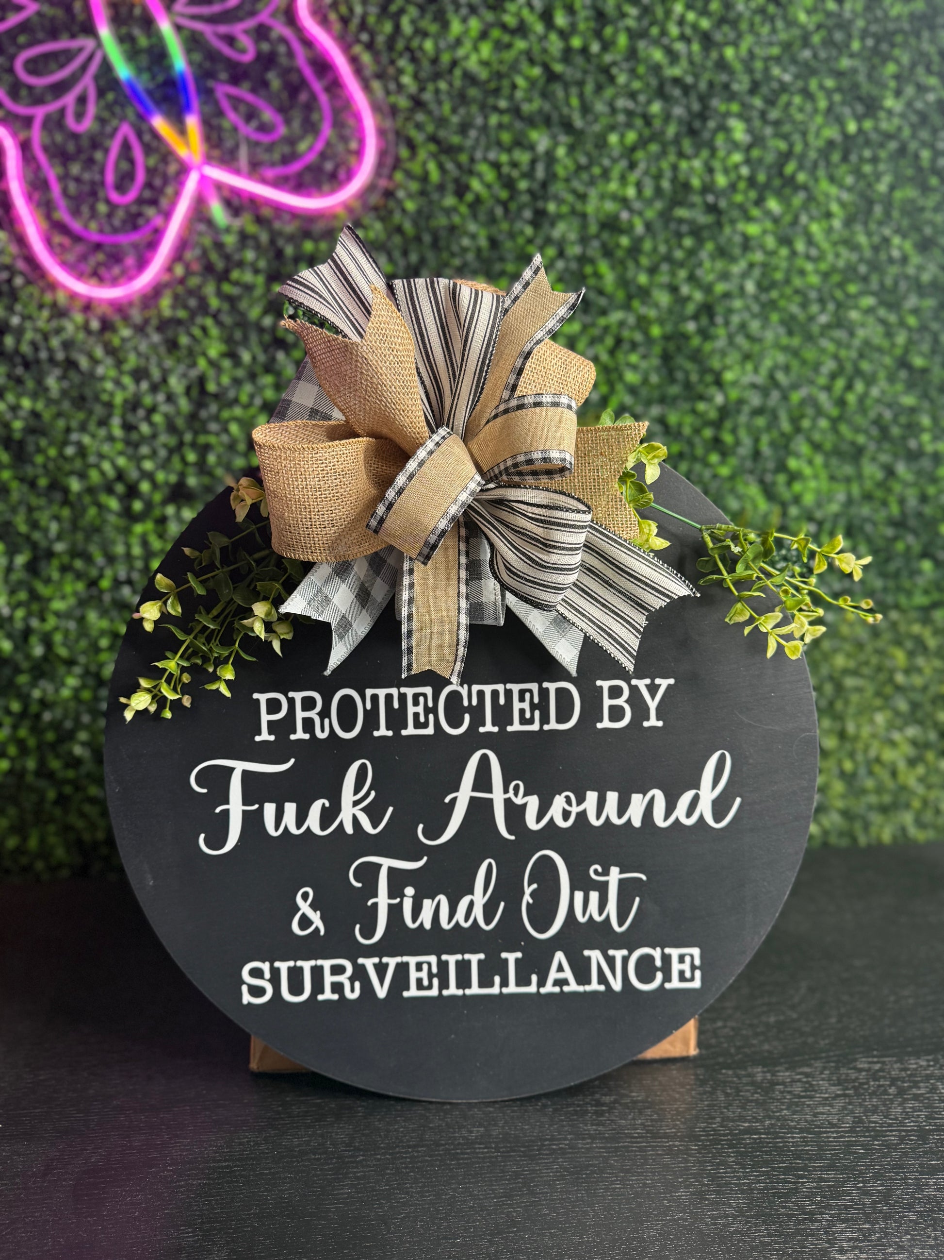This door hanger is Handmade on a 18" round, 1/2" thick birch plywood. Hand stained and painted black. Sealed with a durable topcoat for protection. This Design is made with premium permanent Vinyl. Greenery and bow attached with staples or hot glue. Jute rope attached for hanging.