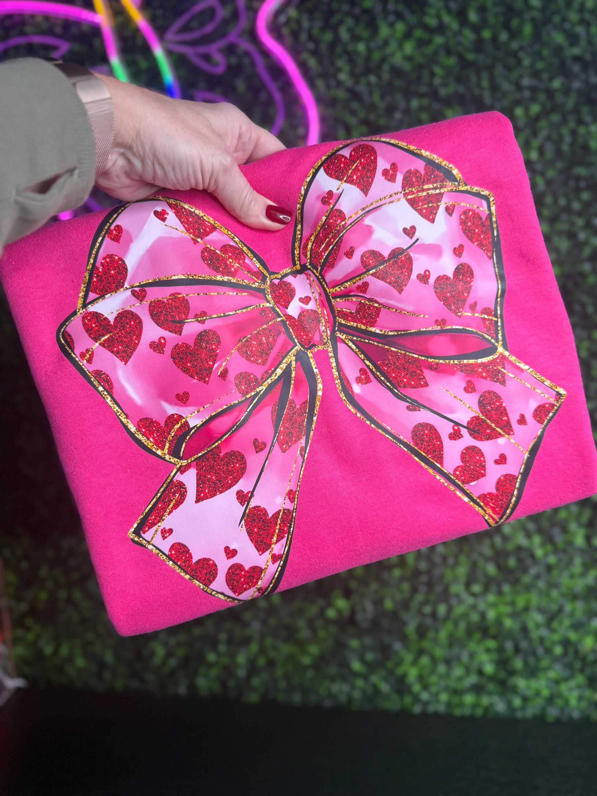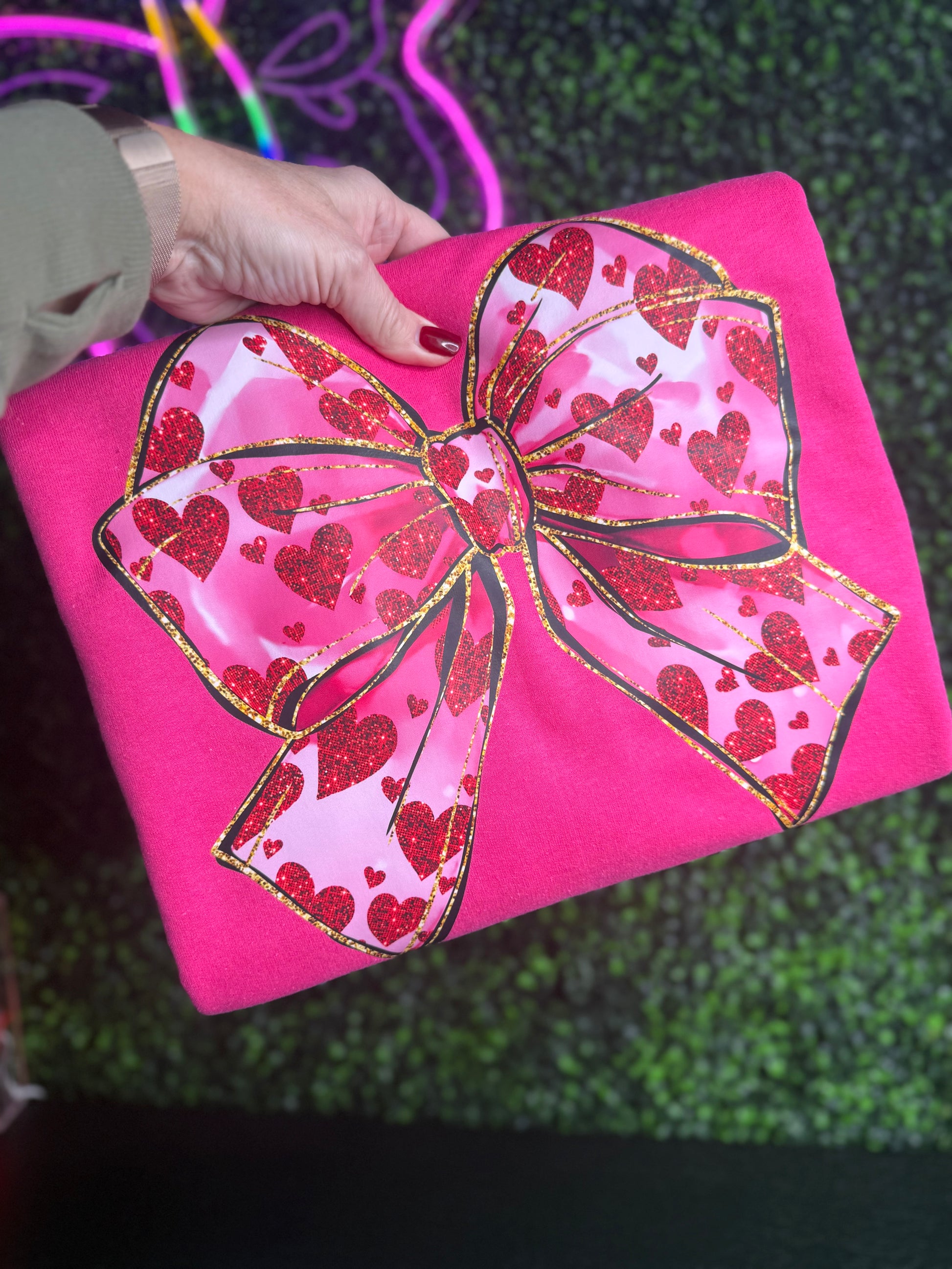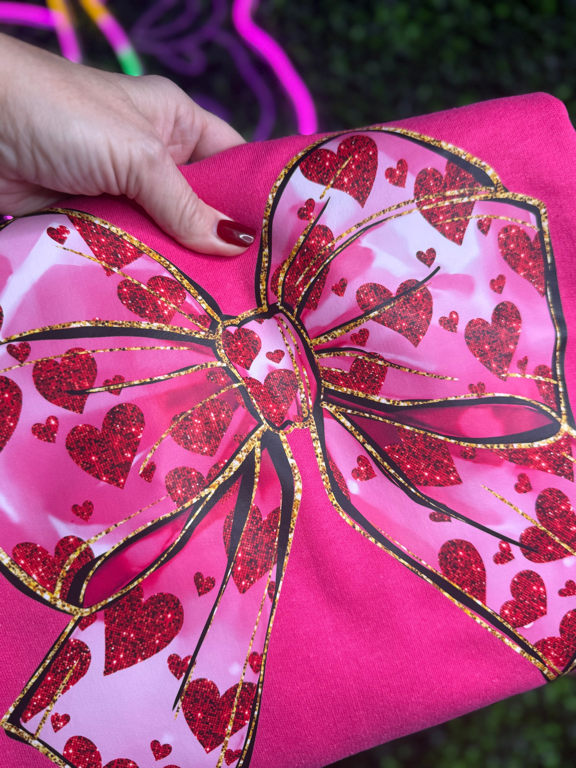 Valentine’s day pink croquet bow sweatshirs. This adorable V-Day sweatshirt is soft cute and full of fun little hearts within the bow. It featuring a bright big croquet bow designs! Soft fleece, relaxed fit, and perfect for everyday wear.