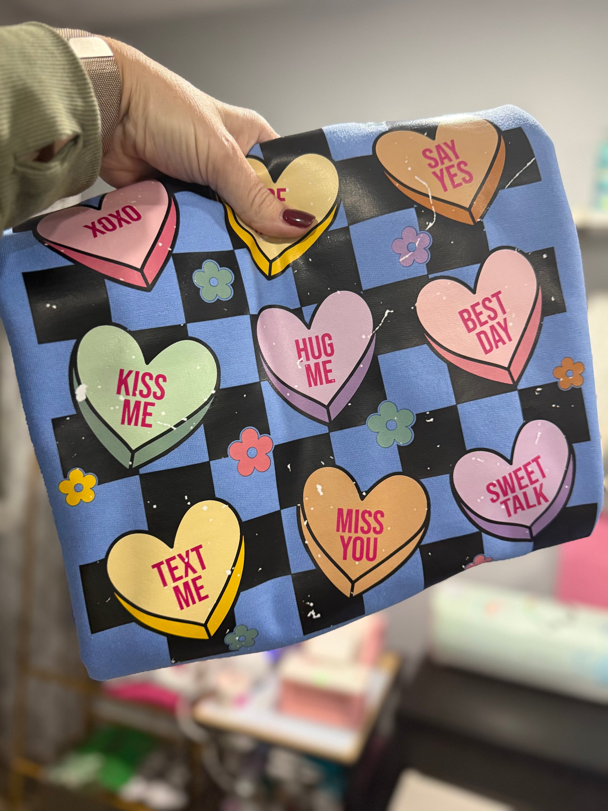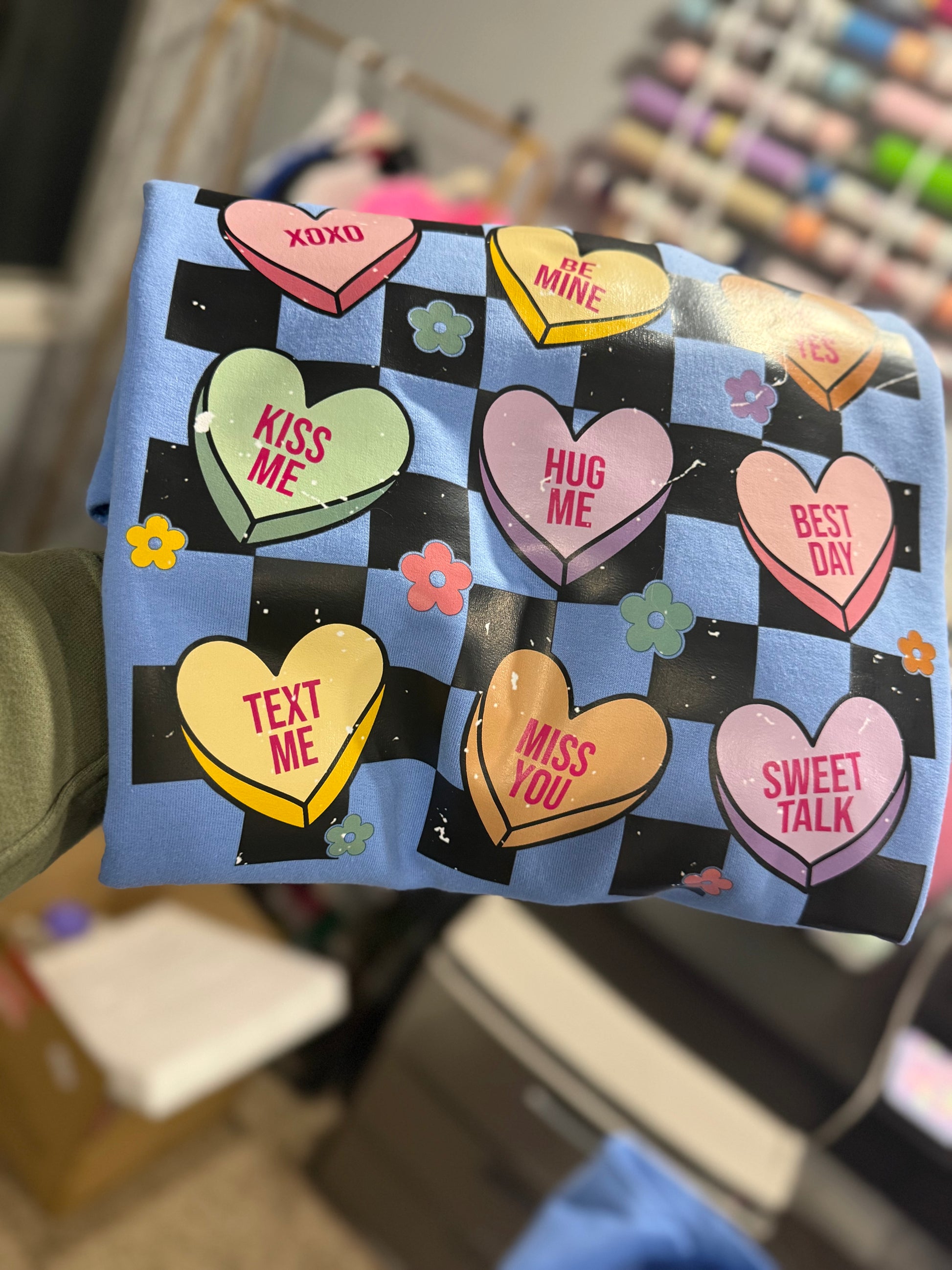 Valentines Day Conversational hearts sweatshirs. This adorable V-Day sweatshirt is soft cute and full of fun love hearts sayings. It featuring a bright candy hearts designs! Soft fleece, relaxed fit, and perfect for everyday wear.